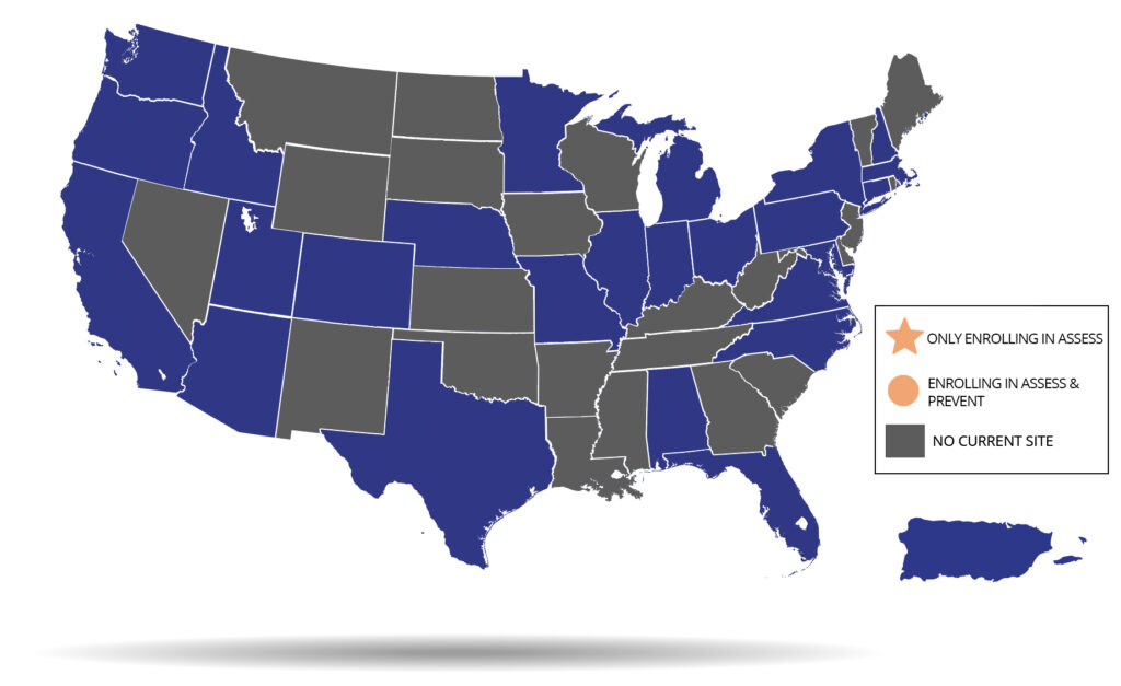 Study visits will be conducted during routine clinical visits or as stand-alone research visits, with either a combination of in-person and remote visits or entirely remote visits. Please see the map and site list below to find the study site closest to you!